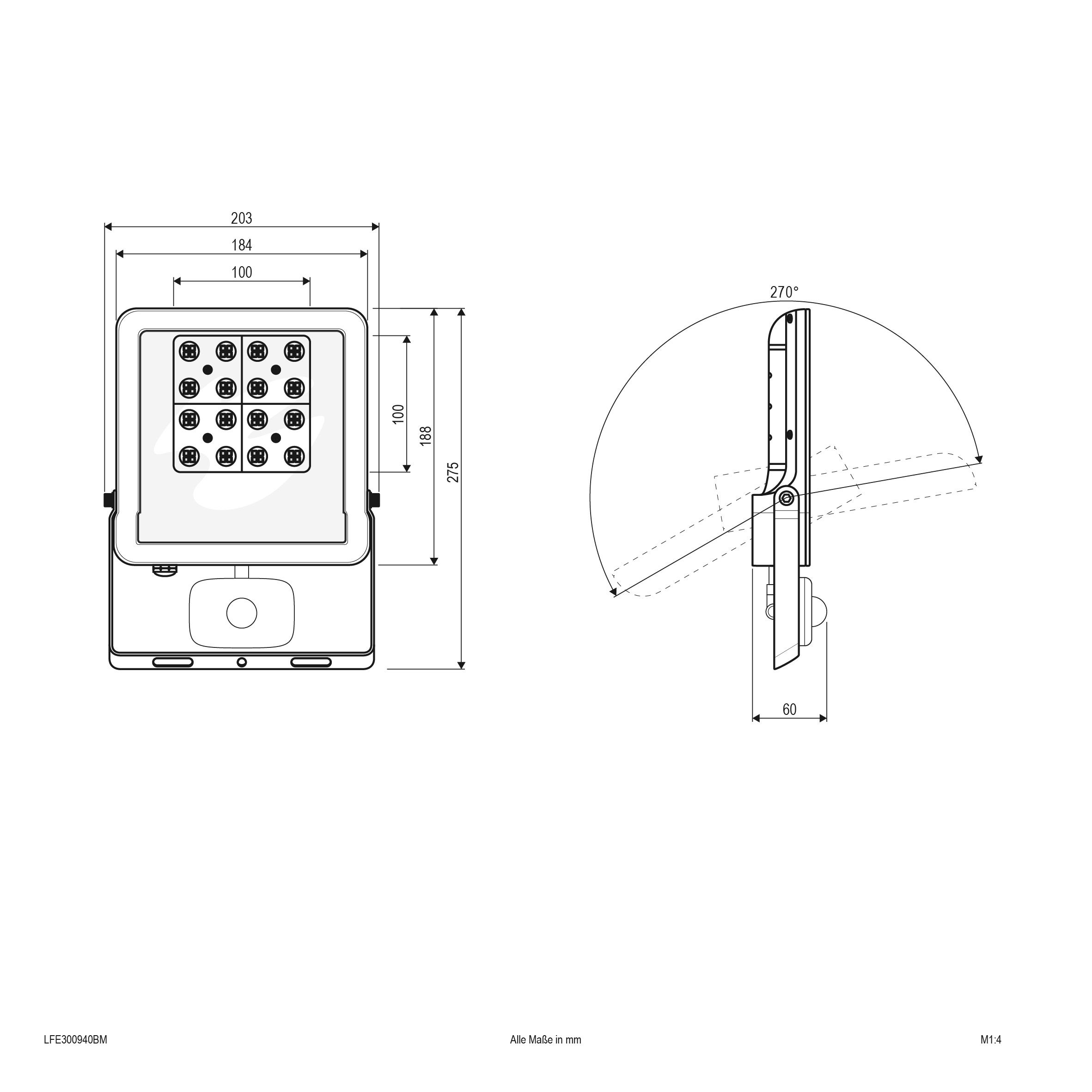 Projecteur d'extérieur LED Panthera à faisceau large avec détecteur crépusculaire et détecteur de mouvement pour raccordement 230V, IP65, 4000 K Le projecteur d'extérieur LED Panthera permet d'éclairer de grandes surfaces blanches neutres à l'extérieur, dans les entrepôts et les halles de production Il est équipé d'un détecteur de mouvement et d'un détecteur crépusculaire qui assurent un éclairage adapté aux besoins et efficace sur le plan énergétique. Panthera peut être orienté grâce à son étrier de montage pivotant et peut être monté de manière polyvalente sur les plafonds, les murs, les sols, les podiums et les rails. Le boîtier en aluminium à revêtement par poudre noir, le cache en verre transparent et les vis en acier inoxydable en font un spot résistant à de nombreux environnements - seuil de crépuscularité, sensibilité et temporisation réglables sur le capteur - câble de raccordement de 1 m avec extrémités de fils libres - résistant à la corrosion selon EN ISO 9227:2012 - ballast inclus - plage de pivotement : 270° - résistance aux chocs : IK08 - température ambiante en fonctionnement : - 20 à + 45 °C