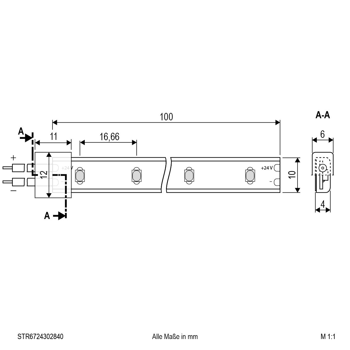 - Distance entre les LED de 16,66 mm chacune ; peut être raccourcie de 10 cm chacune